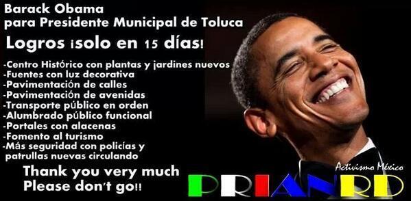 With the Mexican government sprucing up Toluca and sending a massive security detachment in advance of summit, some Mexican Twitter users were circulating a tongue-in-cheek graphic that pleaded for Obama to stay – and even take over as mayor: